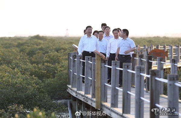 19日傍晚,习近平来到北海金海湾红树林生态保护区考察。沿着木栈道,总书记实地察看红树林生长和保护情况,详细了解红树林作为“海洋卫士”“海上森林”对海洋生态环境的调节作用。他强调,要做好珍稀植物的研究和保护,把海洋生物多样性湿地生态区域建设好。(据“新华视点”微博报道 文字/新华社记者霍小光,摄影/新华社记者鞠鹏、谢环驰)