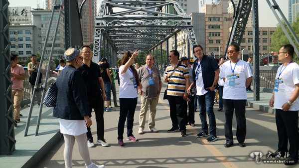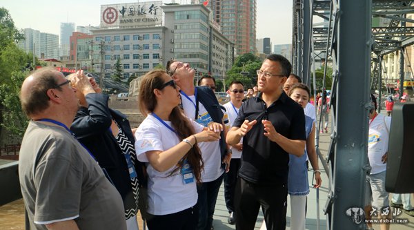 兰州市对外宣传办主任苏勇给德国友人介绍百年黄河铁桥。 贾笑云 摄