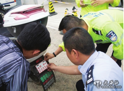 7月3日下午1时,雁滩交警大队大队长罗俊名为一位电动自行车驾驶员发放了我市第一辆电动自行车号牌。