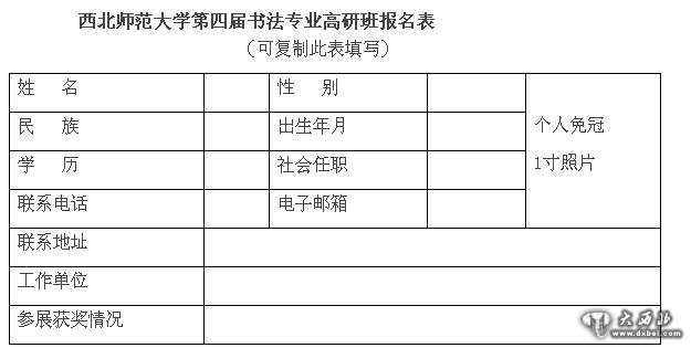 登录西北师范大学美术学院(书法文化研究院)网站,下载“西北师范大学第四届书法专业高研班报名表”,填好后连同近作两幅(临摹、创作各一,7寸高清照片亦可)、身份证复印件挂号寄至:甘肃省兰州市安宁区安宁东路967号西北师范大学书法文化研究院王海雄老师收