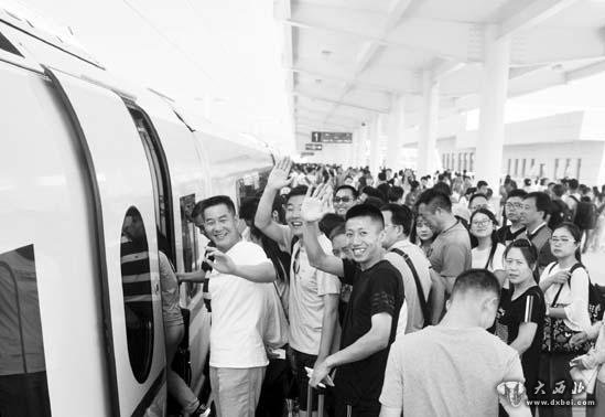天水南站正在登车的乘客喜笑颜开。