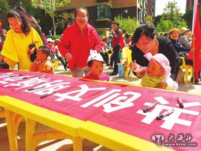 辖区居民在创文宣传条幅上签名