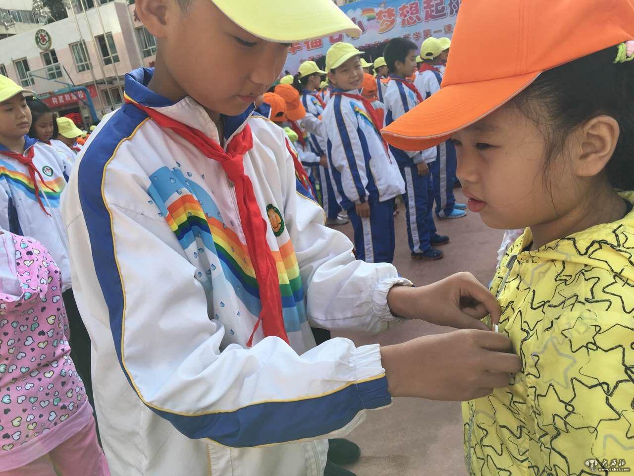 五年级的孩子们为一年级新生佩戴校徽,孩子们向弟弟妹妹们诉说着美好的祝愿,相互击掌盟誓,用自己最真诚的拥抱开启了新的学习生活。