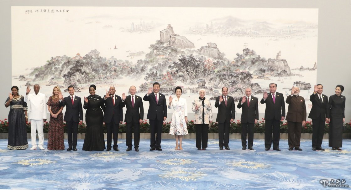 晚6时25分许,金砖国家和新兴市场国家与发展中国家对话会受邀国领导人及配偶相继抵达。习近平和彭丽媛同贵宾们一一握手,互致问候。习近平和彭丽媛同各国领导人及配偶在巨幅水墨画“世界文化遗产鼓浪屿”前合影留念。