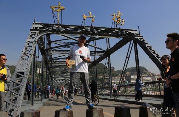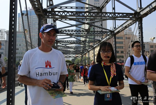 现年44岁的凯·马库斯·熊是德国巴伐利亚州人,他的妻子是中国人。如今,他希望通过个人长跑活动搭建德国与中国之间的“文化桥梁”,增进德国人对中国人的了解。当天上午,马库斯·熊来到中山桥参观,他告诉陪同者:“我要告诉我的孩子这座桥的名字,告诉他这是中德友谊的见证。”之后,马库斯·熊来到金城关,通过讲解员的讲解,全方位地了解了兰州的人文历史。