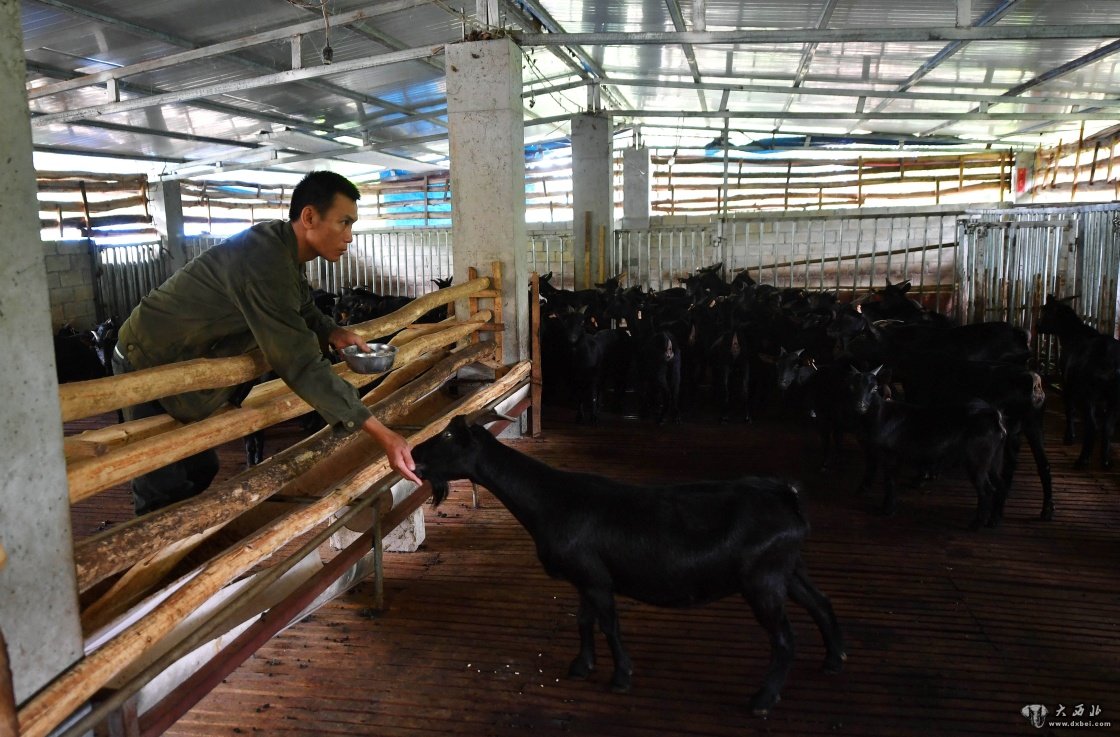 2017年10月18日,在海南省白沙黎族自治县打安镇田表村,村民王金芳在喂黑山羊。新华社记者郭程摄