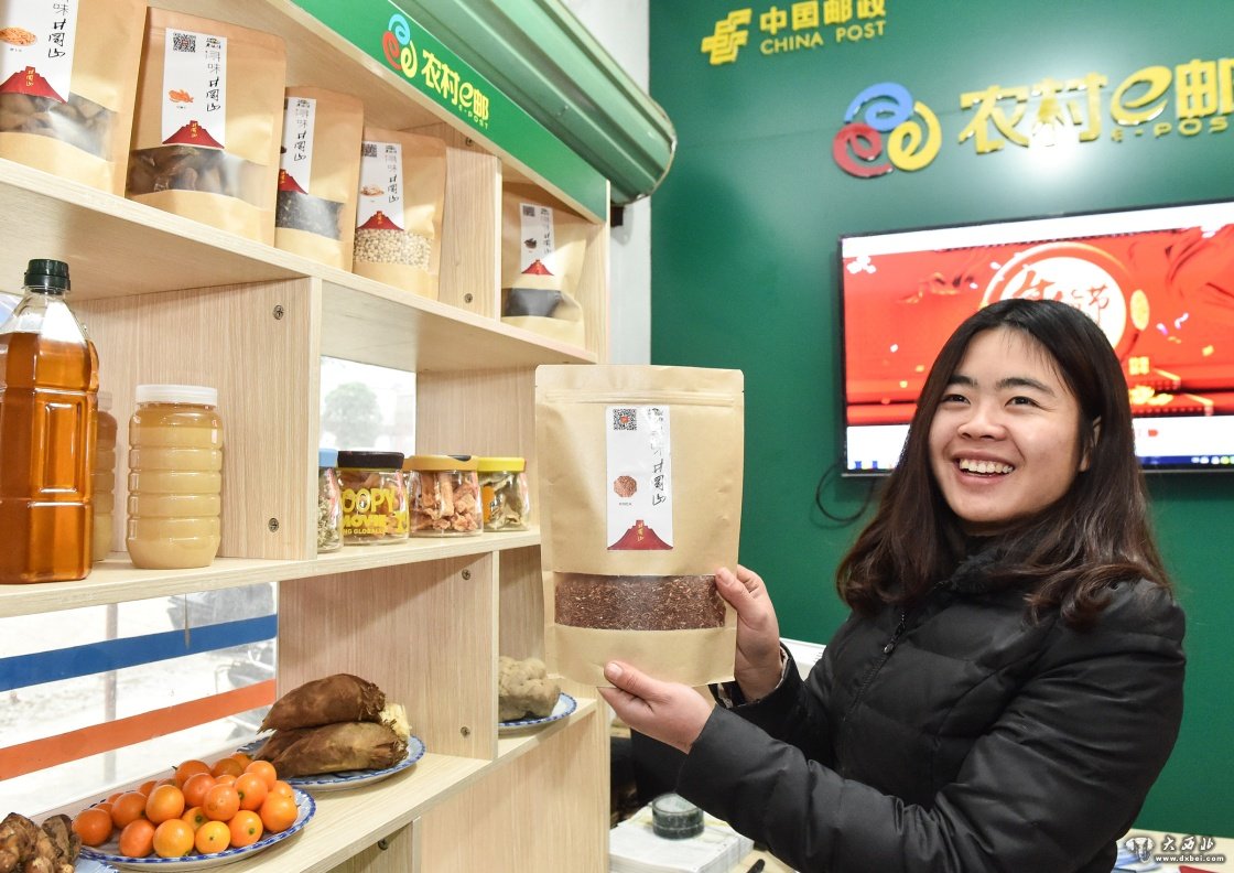 在江西井冈山下七乡,返乡创业的大学生卢琼芳在自己的“农村e邮”服务站点内展示当地特产井冈红米(2016年2月2日摄)。卢琼芳于2015年毕业后就回到家乡,借助网络平台销售贫困户自产的特色农产品,为他们实现了增收的同时也圆了自己的创业梦。