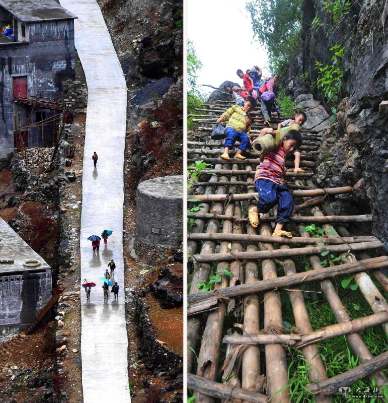 拼版照片:曾经,广西大化瑶族自治县板升乡弄勇村弄顶屯的孩子们扛着生活用具去学校(右图,2012年9月3日摄);如今,水泥公路已经从学校修通到家门口(左图,2017年1月11日摄)。随着脱贫攻坚工作不断推进,原本“千重山,万层岭,不通水,不通电”的广西大石山区发生了翻天覆地的变化。新华社记者黄孝邦摄
