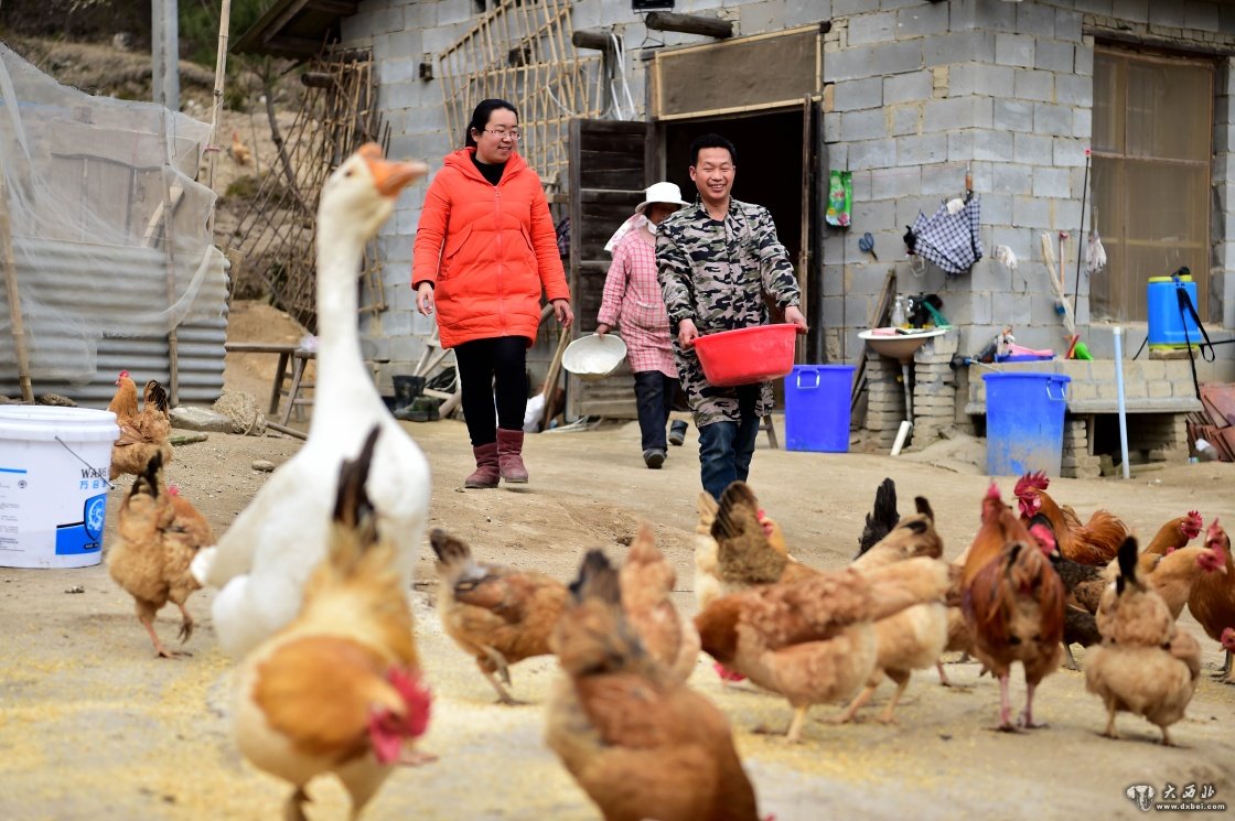 2017年3月6日,安徽省岳西县和平乡和平村第一书记、驻村扶贫工作队队长、“80后”的王珍(左)在贫困户开办的养鸡场里了解情况。新华社记者刘军喜摄