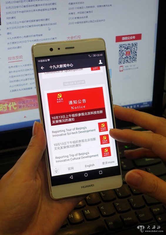 10月21日,一名记者通过手机在十九大新闻中心官方微信公众号上查询信息。