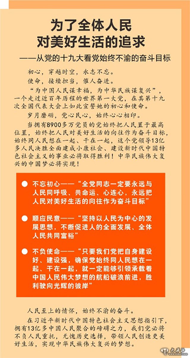 “为中国人民谋幸福,为中华民族谋复兴”,一个走过近百年历程的世界第一大党,在其第十九次全国代表大会上如此宣誓她的初心和使命。