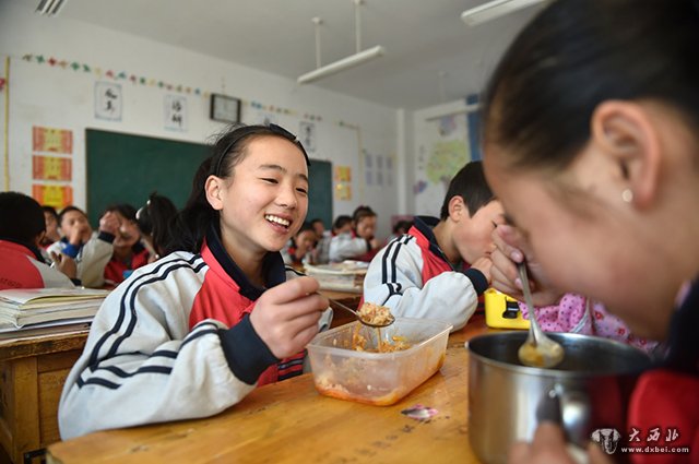 2016年12月15日,宁夏中宁县宽口井中石油希望学校的学生们一起吃免费午餐。