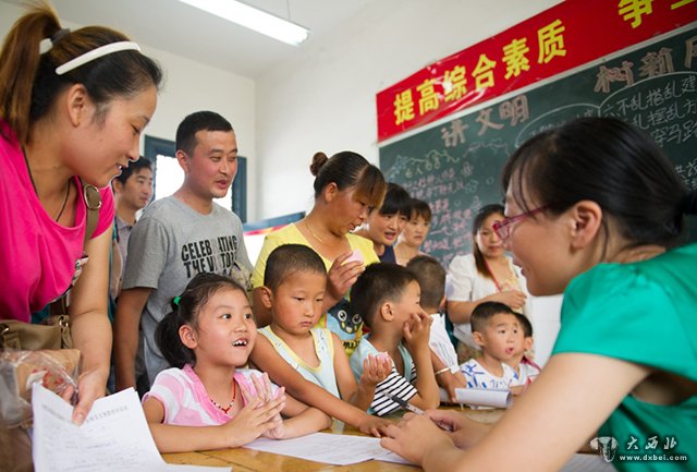 2014年7月10日,在安徽省合肥市和平小学花冲分校报名点,工作人员帮助进城务工人员子女办理报名入学相关手续。