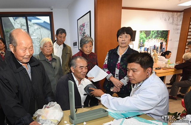 2017年10月12日,老人们在浙江省长兴县渚山村“医养结合”服务点内体检。