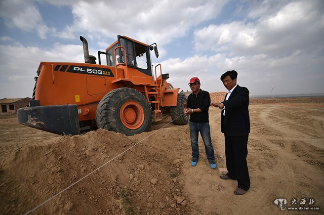 2017年10月20日,在宁夏吴忠市盐池县曾记畔村,十九大代表、村党支部书记朱玉国(右)在工地查看村饲料加工厂的建设情况。