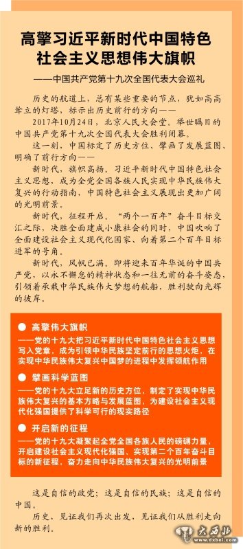 图表:高擎习近平新时代中国特色社会主义思想伟大旗帜——中国共产党第十九次全国代表大会巡礼 新华社记者 卢哲 编制
