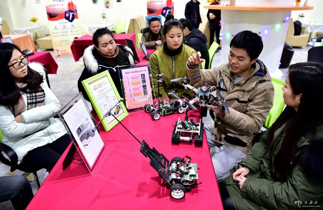 2017年1月22日,在安徽合肥市常青街道创客梦空间,青年创客向参观者介绍飞行器及智能汽车作品。 新华社记者 刘军喜 摄