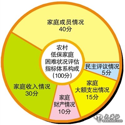 农村低保家庭困难状况评估指标体系由家庭成员情况、家庭收入情况、家庭财产情况、家庭大额支出情况、民主评议情况等5个指标组成,采取百分制计分方式,综合评估得分最高者排名最前,为最困难家庭。