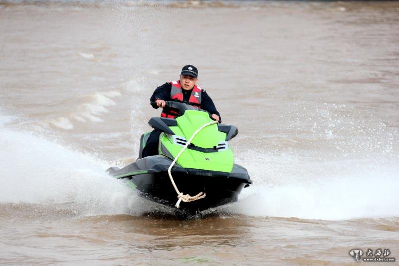 赵爱书记宣布首航出发后,兰州公安巡逻指挥艇编队首航,并演示了巡逻艇水炮操作。