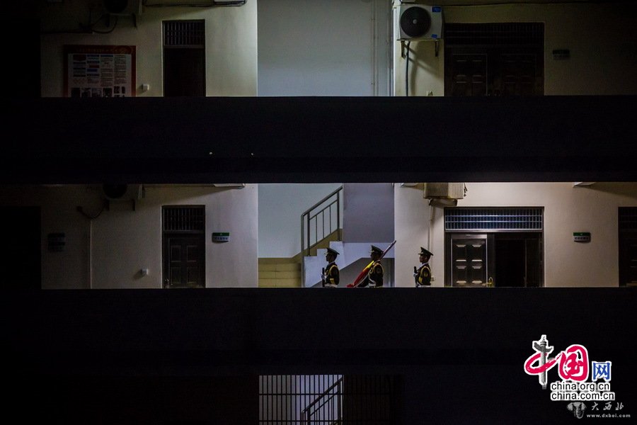 每到升旗仪式当天,赵凯龙都会比平时早起1个小时开始准备,为了不影响战友休息,他会在宿舍的走廊上把自己的皮靴擦得一尘不染,用他的话说就是,只有身着一尘不染的军装,才能配上飘扬的五星红旗。中国网记者郑亮摄