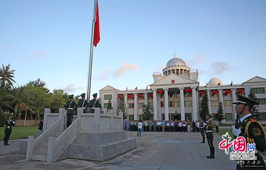 2017年10月1日,永兴岛三沙市政府门前举行升旗仪式,庆祝国庆,在这样的日子升旗,对祖国南段的三沙市有着尤为重要的意义。武警海南省总队驻三沙市中队供图