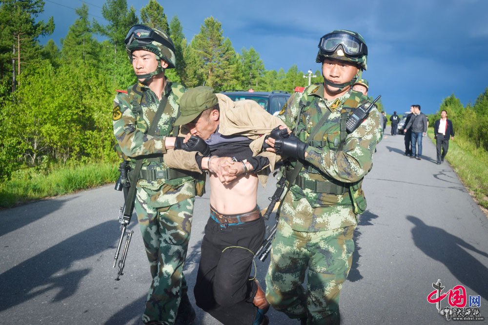 2013年6月8日早上八点,距离漠河县城90公里外的阿木尔林业局发生了一起持枪杀人案。县公安局请求武警中队支援,中队接到指令后,立即采取兵分三路的战法。排长朱军飞带领一组沿江布控,一班班长白海波带领二组把守沿途公路,指导员伍逢成带领防爆小分队沿逃跑方向实施追捕,成功将犯罪嫌疑人抓获。(漠河县中队供图)