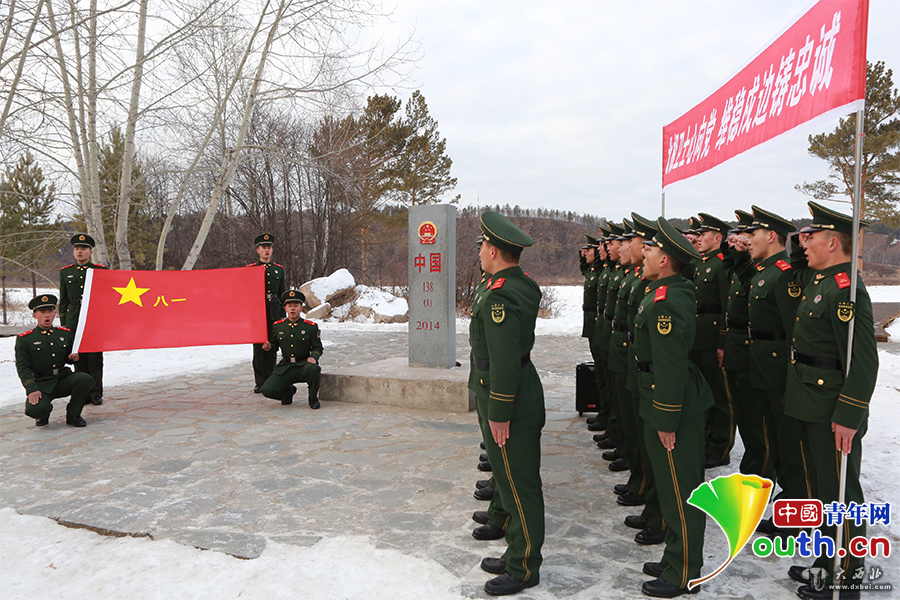 党的十九大胜利闭幕后,武警大兴安岭支队漠河中队官兵在138界碑旁隆重举行仪式向军旗宣誓。中国青年网记者卢冠琼摄