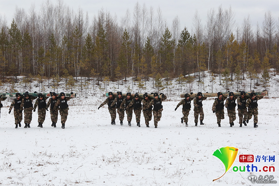 武警大兴安岭支队漠河中队官兵开展极限抗寒体能训练。资料图
