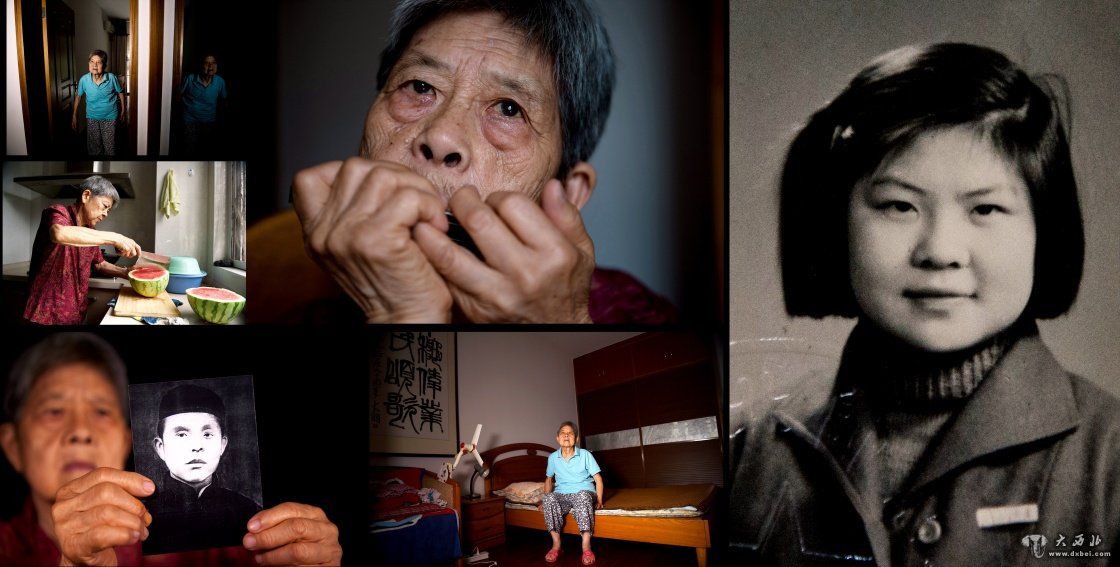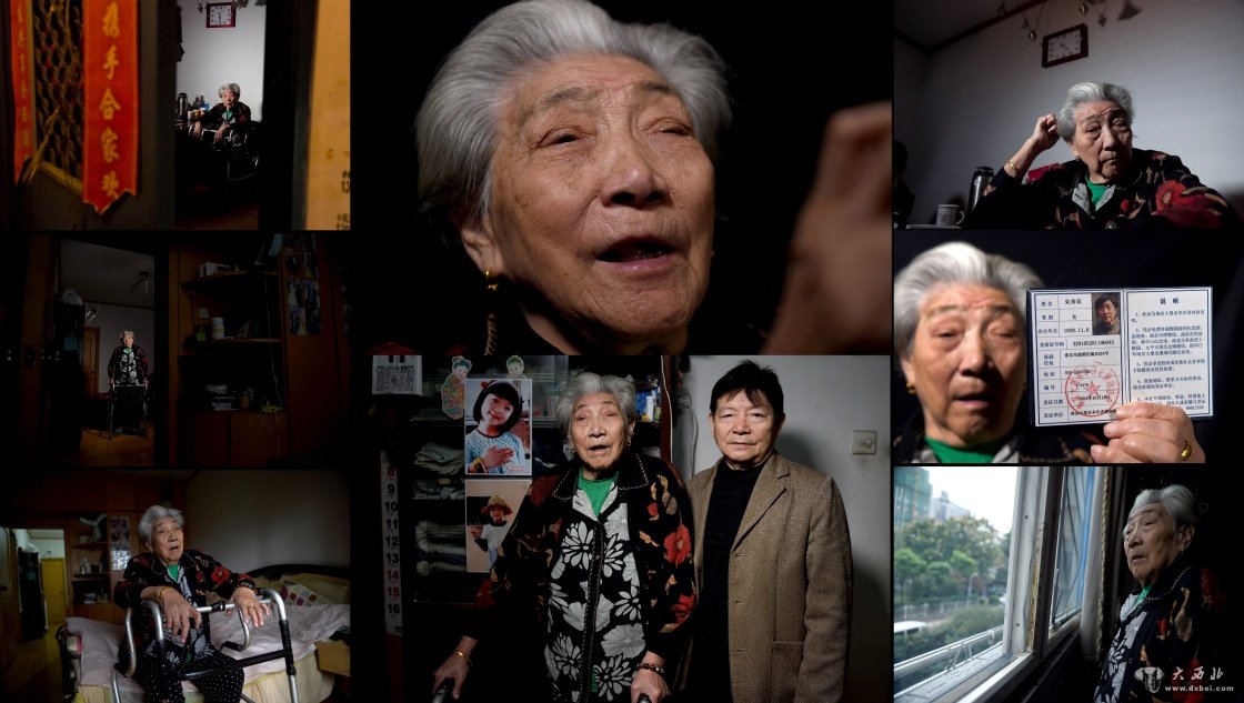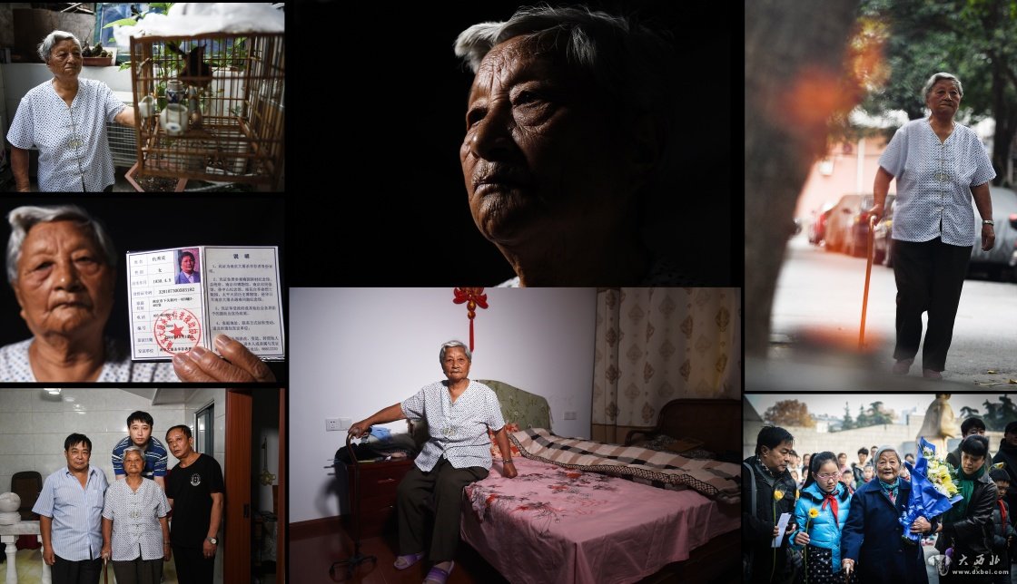 中上:回忆往事中的仇秀英;中下:仇秀英在家中卧室;左上:仇秀英在家中逗鸟;左中:仇秀英展示自己的南京大屠杀幸存者证;左下:仇秀英与大儿子李金诚(左)、小儿子李金士(右)、孙子李超(后)合影;右上:仇秀英在小区里散步(2017年9月29日摄)。右下:仇秀英在侵华日军南京大屠杀遇难同胞纪念馆进行家祭(2016年12月4日摄)。