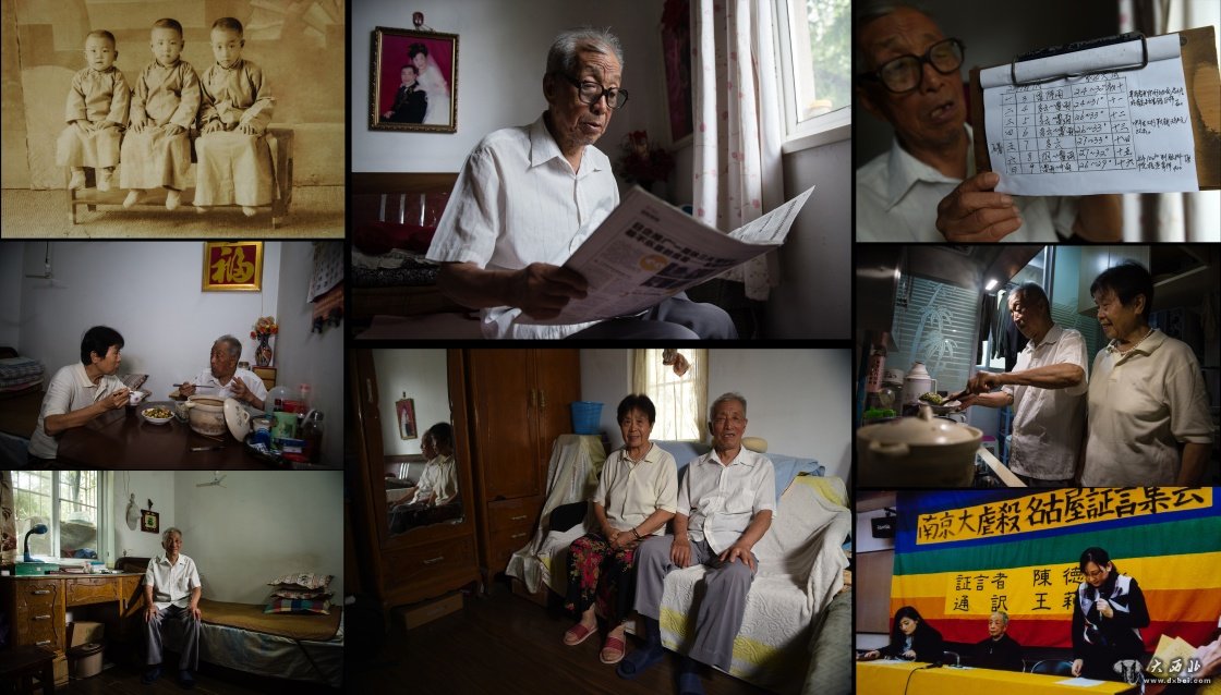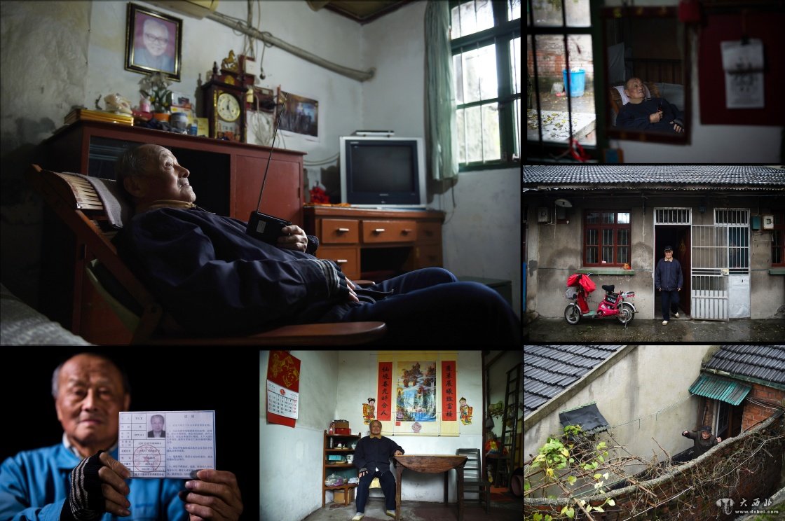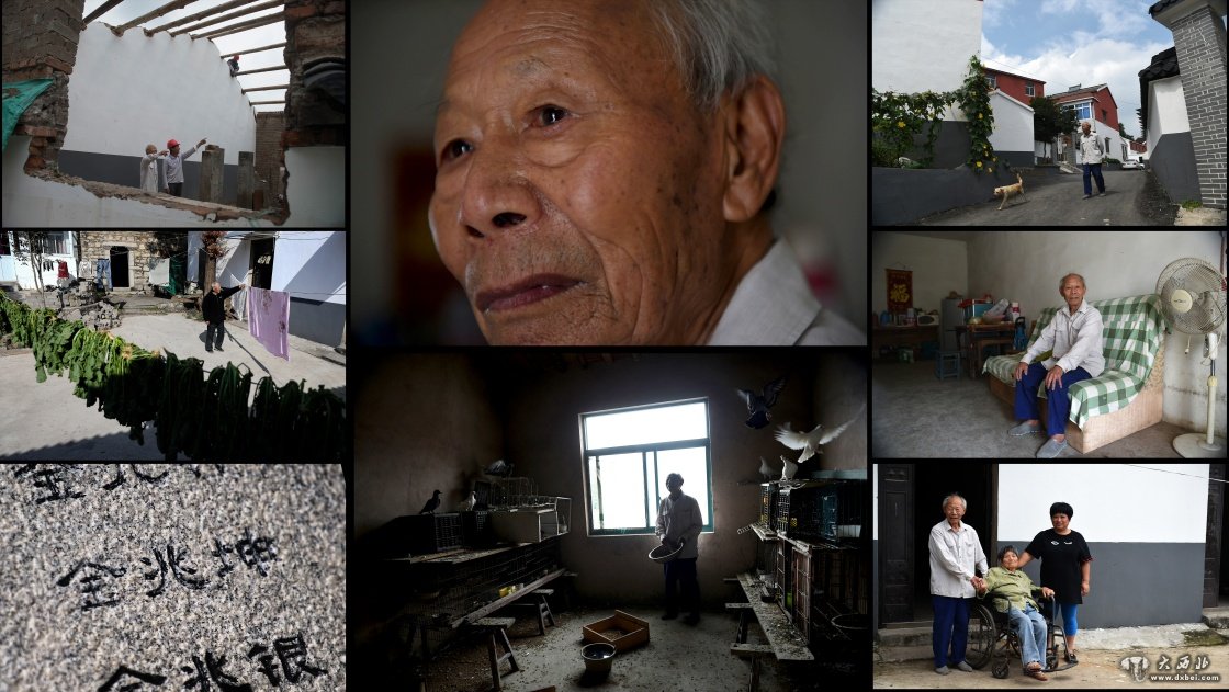 中上:金茂芝肖像;中下:金茂芝在阁楼喂养信鸽;右上:金茂芝在村里散步;右中:金茂芝在自己家中;右下:金茂芝(左)在院中与老伴、小女儿金秀琴合影;左上:金茂芝(左)在自建房施工现场与工人交流(2017年9月7日摄)。左中:金茂芝在自家院里晾晒床单(2017年12月5日摄)。左下:侵华日军南京大屠杀遇难同胞纪念馆名单墙上金茂芝父亲金兆坤的名字(2017年11月19日摄)。