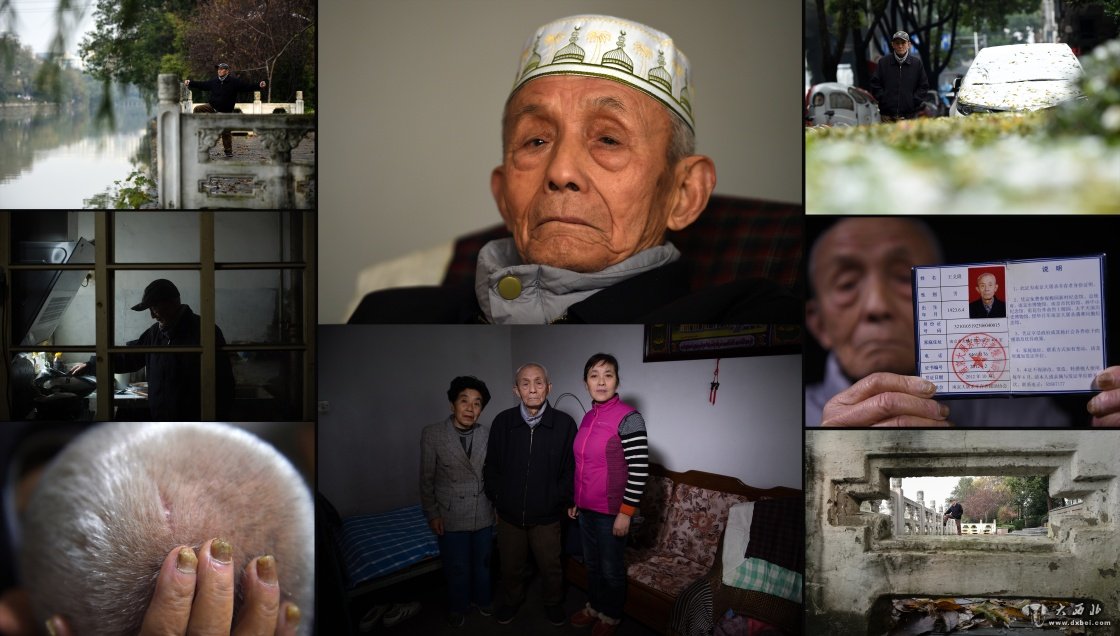 中上:王义隆老人在家中;中下:王义隆(中)和大女儿王富香(左)、小女儿王进勤合影;左上:王义隆在家附近的秦淮河畔健身;左中:王义隆在厨房忙活;左下:王义隆展示当年被日军砍伤头部留下的刀疤;右上:王义隆在户外散步;右中:王义隆展示他的南京大屠杀幸存者证;右下:王义隆在家附近的秦淮河畔(拼版照片,2016年11月24日摄)。
