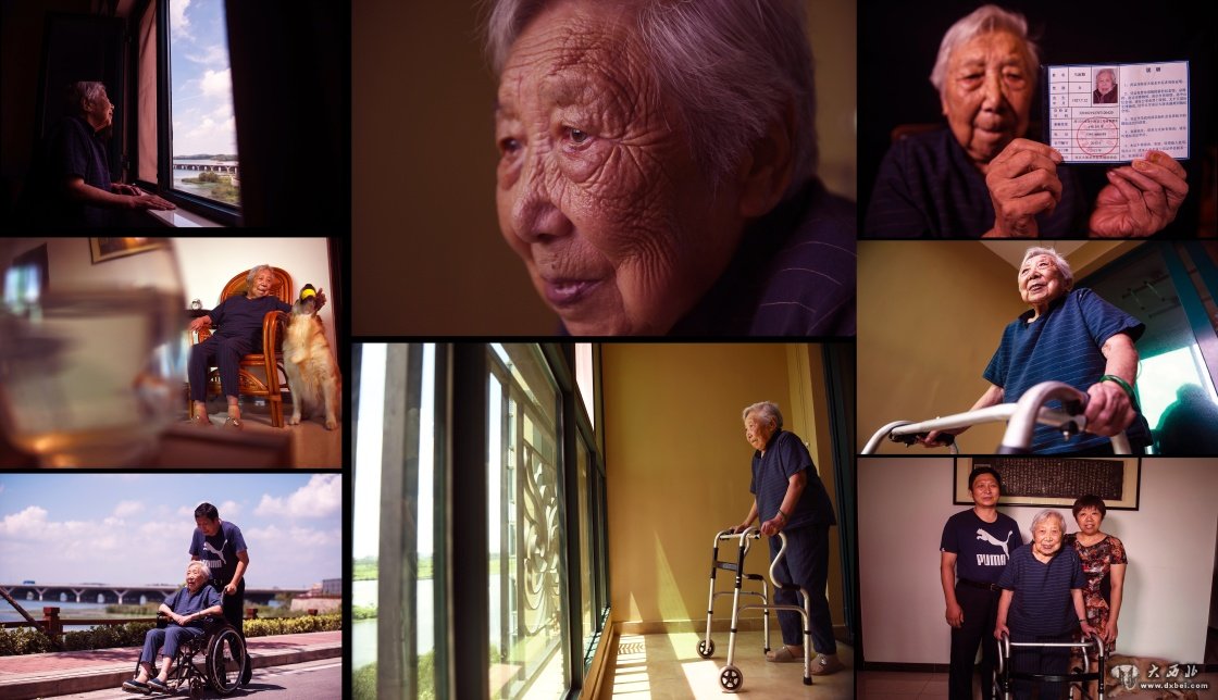 中上:马淑勤老人肖像;中下:腿脚不便的马淑勤只能靠拐杖车行动;左上:马淑勤在窗前眺望;左中:马淑勤在家中和宠物犬玩耍;左下:养子马立推着马淑勤在小区里散步;右上,马淑勤展示她的南京大屠杀幸存者证;右中:倔强的马淑勤平时不愿被人搀扶;右下:马淑勤(中)和养子马立(左)、儿媳杜贞合影(拼版照片,2017年8月22日摄)。