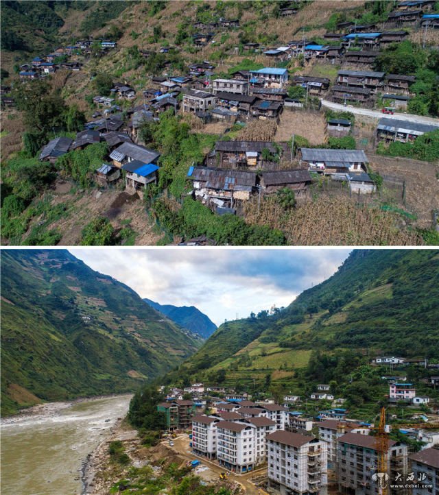 拼版照片:上图是云南省怒江傈僳族自治州泸水市洛本卓白族乡金满村的群众旧居(10月15日摄);下图是经过易地扶贫搬迁后的位于怒江边的金满村群众新房(10月14日摄)。新华社记者 胡超 摄