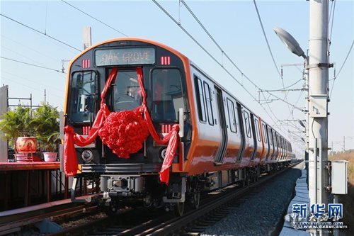 中车长春轨道客车股份有限公司研制的首批美国波士顿橙线地铁车在长春下线,成为首次登陆美国市场的国产轨道交通装备。图片来自:新华网