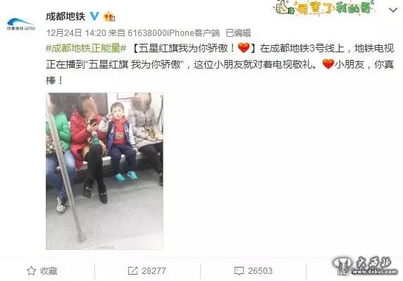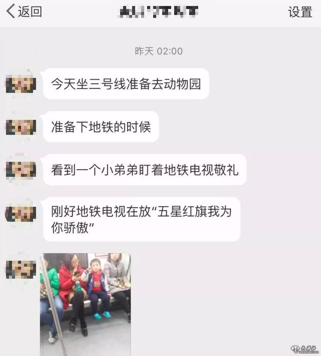 据微博@成都地铁称,在成都地铁3号线上,地铁电视正在播到“五星红旗我为你骄傲”,这位小朋友就对着电视敬礼。