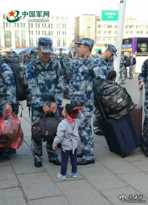 小军娃送别爸爸:北部战区空军某部在火车站送别分流官兵,集合哨声响起后,一位军嫂让孩子给身穿迷彩服的爸爸敬个礼。听到敬礼口令,小军娃举起幼稚的小手,敬了一个不太标准的军礼,让很多人动容。
