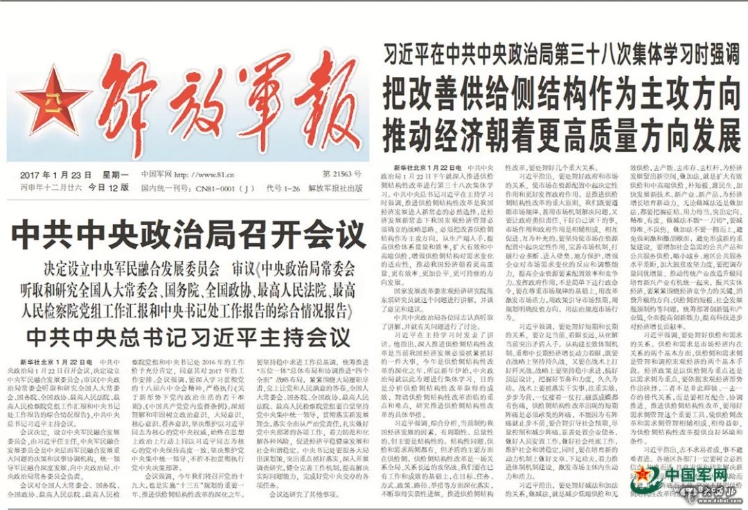 1月22日,中共中央政治局召开会议,决定设立中央军民融合发展委员会,由习近平任主任。中央军民融合发展委员会是中央层面军民融合发展重大问题的决策和议事协调机构,统一领导军民融合深度发展,向中央政治局、中央政治局常务委员会负责。