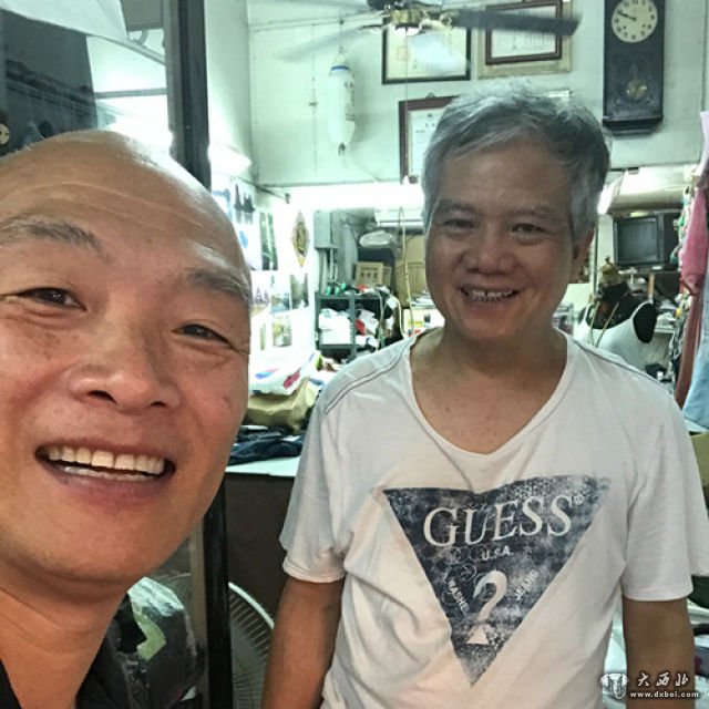 何自力(左)在台湾采访一家裁缝铺后与店主合影。