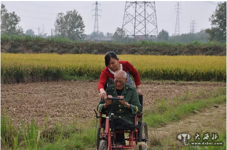 邵桃荣推着黄礼和走在乡间小路,感受自然。武汉市文明办供图