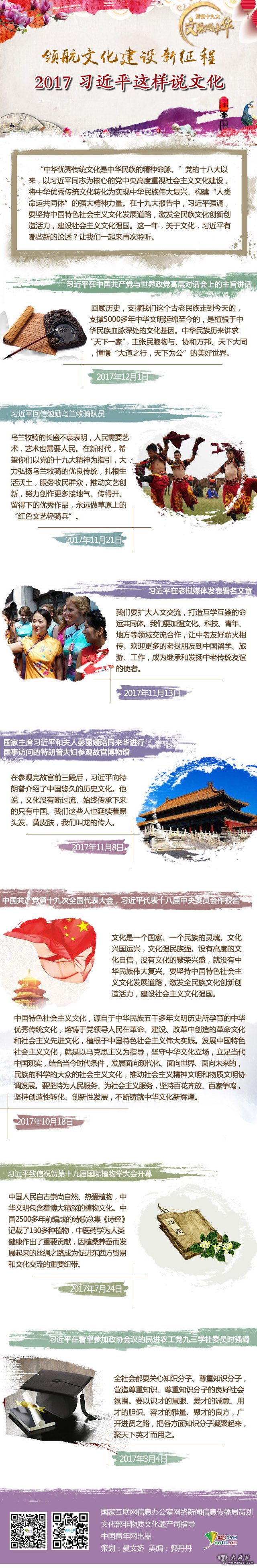 中国青年网北京12月31日电(记者曼文娇)“中华优秀传统文化是中华民族的精神命脉。”党的十八大以来,以习近平同志为核心的党中央高度重视社会主义文化建设,将中华优秀传统文化转化为实现中华民族伟大复兴、构建“人类命运共同体”的强大精神力量。在十九大报告中,习近平强调,要坚持中国特色社会主义文化发展道路,激发全民族文化创新创造活力,建设社会主义文化强国。这一年,关于文化,习近平有哪些新的论述?让我们一起来再次聆听。