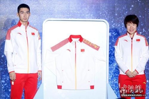 资料图:平昌冬奥会中国体育代表团领奖服“冠军龙服”正式亮相。图为中国运动员代表武大靖与周洋展示领奖服。中新社记者韩海丹摄
