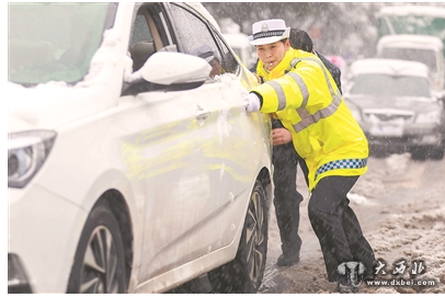 1月4日早上7点,南京市港城路江畔东路路口,一位身着警服的男子笔挺地矗立在纷飞的大雪中,一手还高举雪铲,铲上擎着一根电缆线,成为风雪中独特的“风景”。原来,被大风刮落的监控电缆线堵住了过往通道,正值早高峰期间,导致交通拥堵不畅。这一幕恰好被彻夜巡逻尚未回家的交警七大队民警沈彦遇到。在第一时间汇报大队指挥室后,为保障来往车辆安全畅通,沈彦尝试用手撑举电缆线。怎料,身高1.80米的他还是够不着,急中生智,他利用地上的雪铲做撑杆,再举起胳膊,顺利将电缆撑起足够高度,终于让车辆顺利通行。