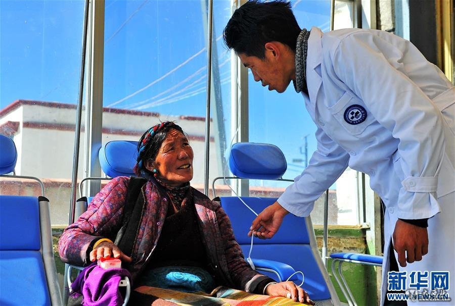 在普玛江塘乡卫生院,旺扎为一名患者输液(1月14日摄)。新华社记者张汝锋摄