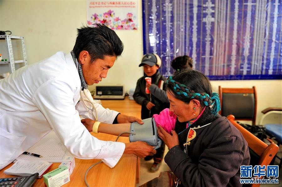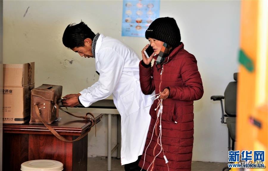 在普玛江塘乡卫生院,旺扎为农牧民查体(1月14日摄)。新华社记者张汝锋摄