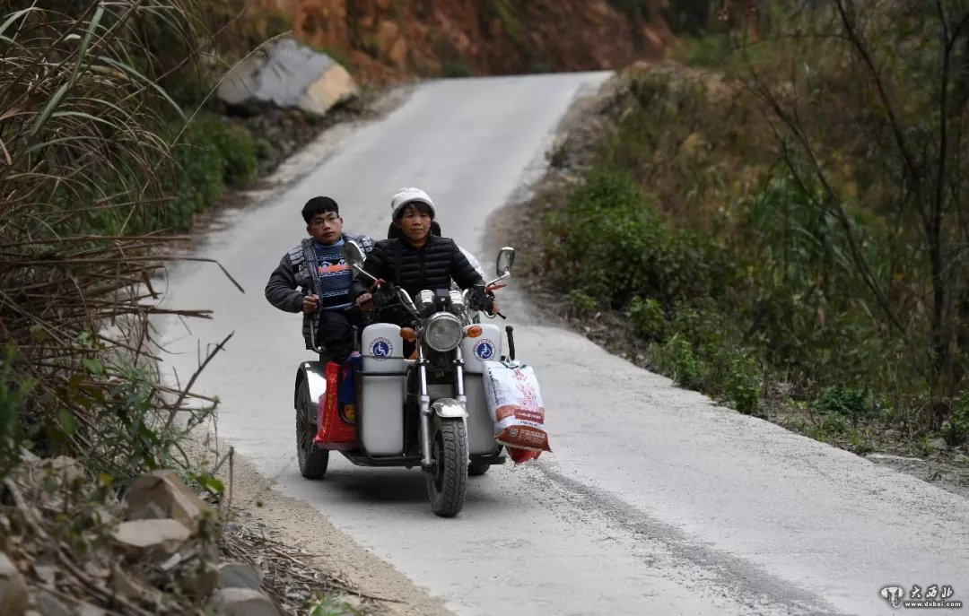 在广西东兰县隘洞镇板康村,黄乜鲜用三轮车载着儿子黄必华行驶在上学的路上。