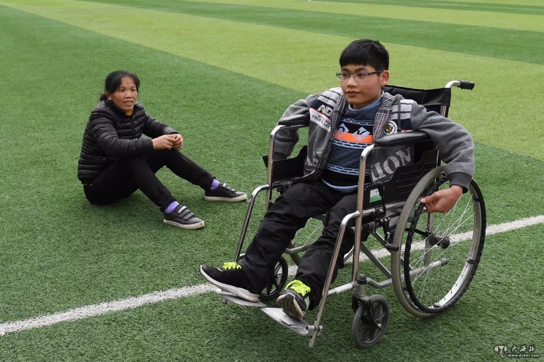 在广西东兰中学运动场,黄乜鲜看着儿子黄必华练习操作轮椅。