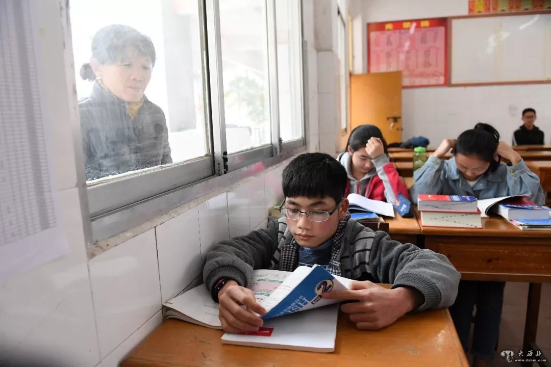 在广西东兰中学,黄乜鲜在教室外看儿子黄必华学习。