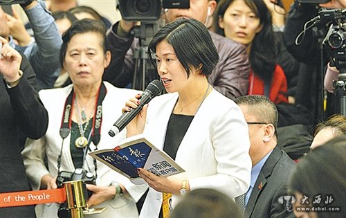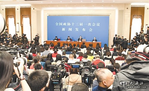 3月2日,全国政协十三届一次会议新闻发布会在北京人民大会堂举行,大会新闻发言人王国庆向中外媒体介绍会议有关情况并回答记者提问。右图为经济日报·中国经济网记者廉丹就经济发展问题提问。经济日报-中国经济网记者高兴贵摄