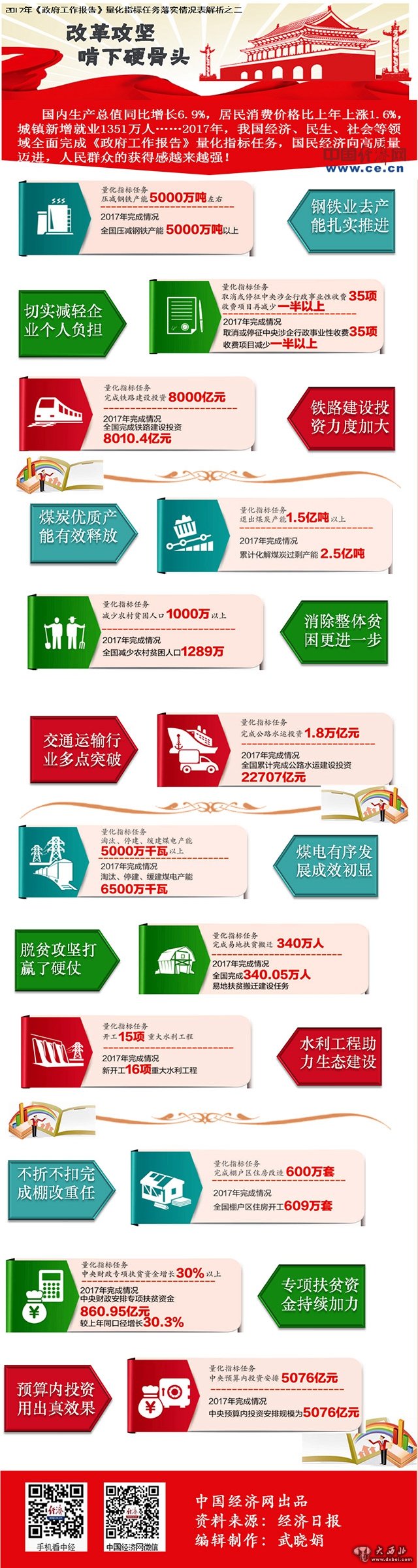 经济日报-中国经济网编者按:国内生产总值同比增长6.9%,居民消费价格比上年上涨1.6%,城镇新增就业1351万人……2017年,我国经济、民生、社会等领域全面完成《政府工作报告》量化指标任务,国民经济向高质量迈进,人民群众的获得感越来越强!