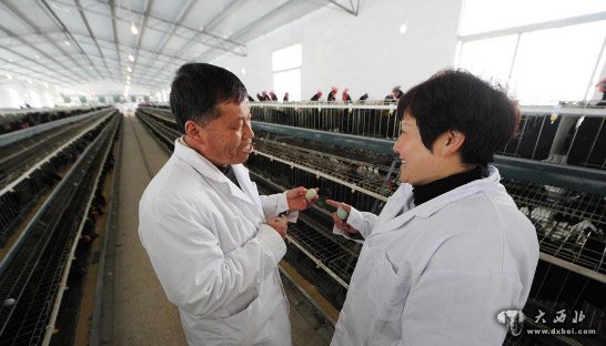 余留芬(右)在岩博村种鸡养殖场向工作人员了解养殖场生产情况(2014年1月14日摄)。新华社记者陶亮摄